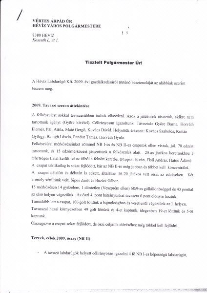 Hévíz Labdarúgó KFT 2009. évi gazdálkodásának bemutatása 2