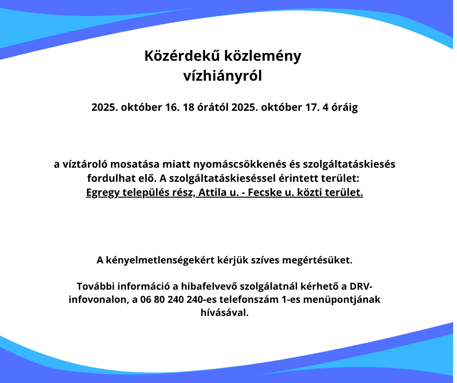 A DRV Zrt. közleménye alapján ezúton tájékoztatjuk a tisztelt Lakosságot és a felhasználókat, hogy 2025. október 16. 18 órától 2025. október 17. 4 óráig a víztároló mosatása miatt nyomáscsökkenés és szolgáltatáskiesés fordulhat elő.
