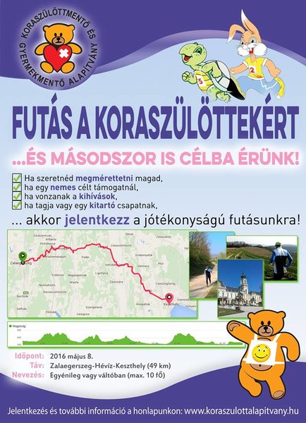 A jelen futás jelképes is azonban: a Koraszülöttmentő és Gyermekintenzív Alapítvány mentőautója rendszeresen járja Zala megyét, néha annak határait is átlépve, hogy koraszülötteket mentsen. A Zalaegerszeget Keszthellyel összekötő futással a mentőautó által megtett távokat szimbolizálják a futók, az önkéntes segítők és a nézők a pálya teljes, mintegy 50 km-es hosszában.